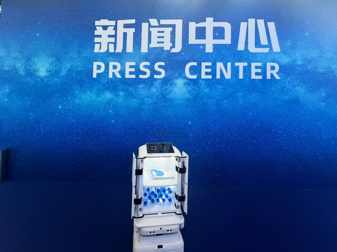 巡游送水服务:UP机器人像一位贴心的服务生,携带饮品在新闻中心二楼全场巡游。它会按预设路线工作,当然如果前方人群密集,它会自动感知并自主避障,顺畅前行,提供“随时随地取水”的智能服务。