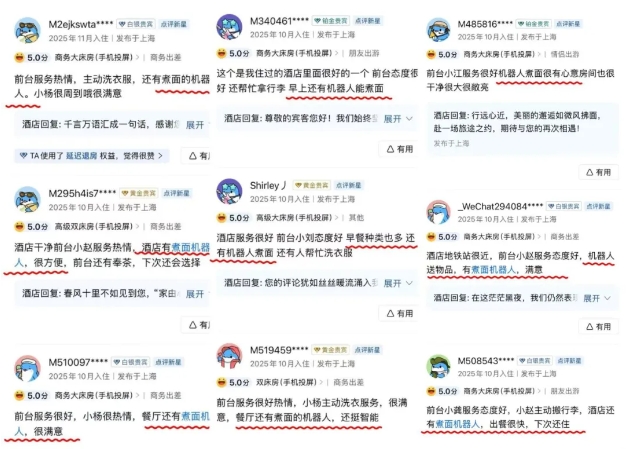 首旅如家上海门店客人好评(部分),展现了对云迹煮面机器人的喜爱