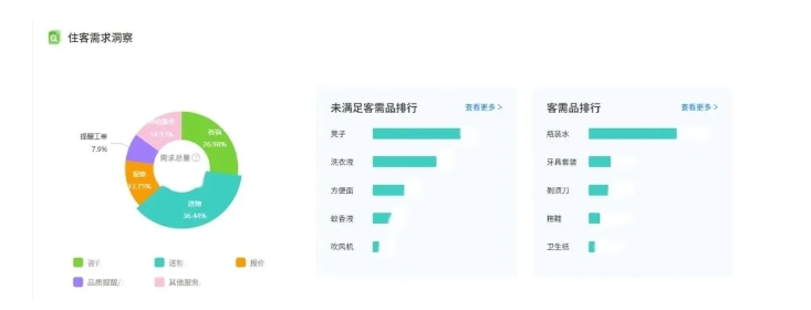 而这些数据洞察也会成为管理者优化的参考——在送物需求中,“水”的需求量最高;同时,“凳子”“洗衣液”等未满足需求也清晰可见,当这些需求达到一定频次,酒店即可针对性补充,实现从被动响应到主动满足的服务升级。