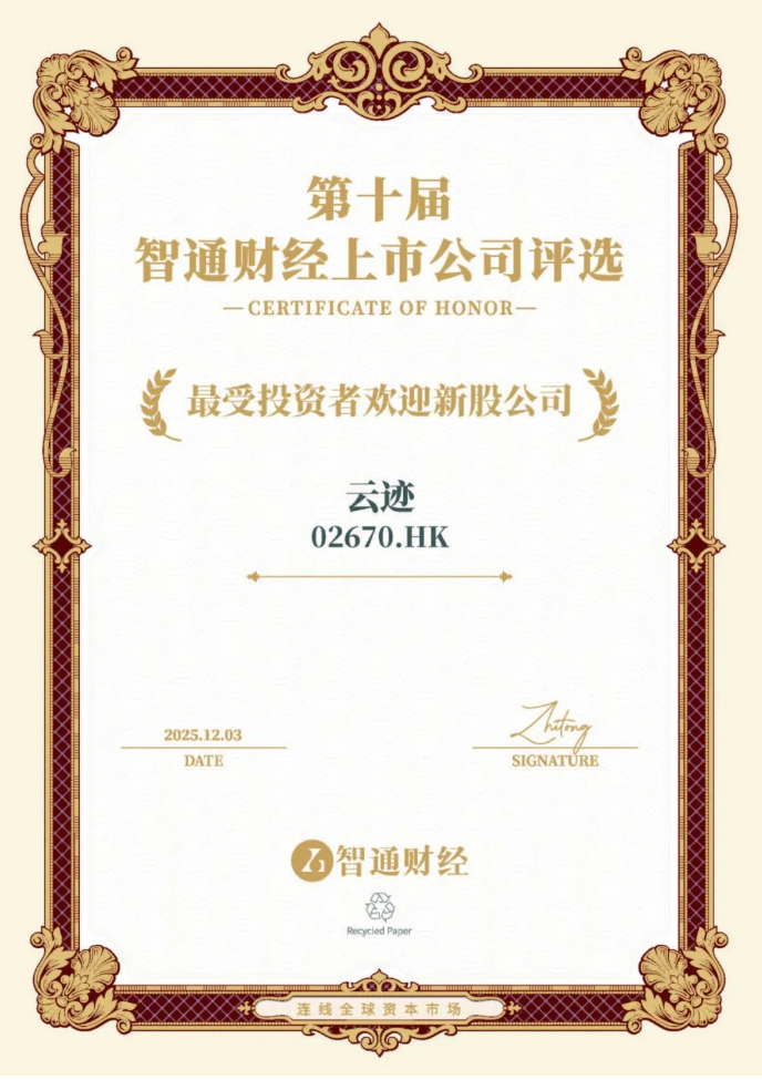 12月3日,“第十届智通财经上市公司颁奖盛典”隆重举行。凭借上市以来持续的市场关注度、投资者的积极参与以及稳健的市场表现,云迹科技(02670.HK)荣获“最受投资者欢迎新股公司”奖项。