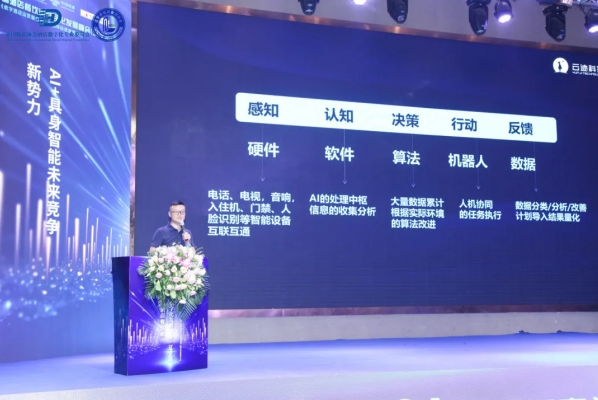 云迹科技CPO李全印在会上发表《AI+具身智能未来竞争新势力》主题演讲,他表示:从2015年云迹科技的机器人走进酒店到现在累计为全球3万家酒店,还有几百家医院、工厂、楼宇等提供智能化服务。应用上,能进行7X24小时全时段、多场景、多任务执行。目前已开放API端口100余个实现感知、认知、决策、执行、反馈All in A I。