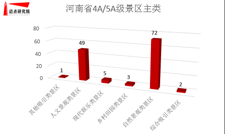 观察河南省的4A/5A级景区品类占比,大部分景区都是文化属性和旅游属性高度重合的景区。其中,自然景观类占据大壁江山,在各类型景区中数量和占比最高,多达72家,占比约为55%。