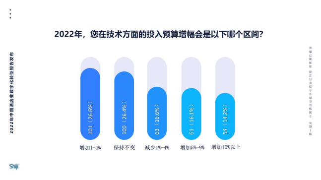 2022年的调查结果进一步显示,行业将继续追加在技术方面的投资。其中,16.1%的受访者预计2022年在技术方面的投入预算增幅在5%-9%之间,更有超过14%的受访者预计增幅达到10%以上。这说明中国酒店业对技术应用的重视程度在进一步加深,国内酒店业对IT投资的热情依旧。