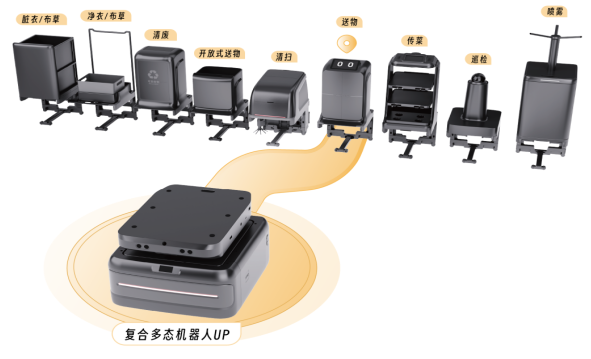 在形态方面,“UP”机器人展现出独特的多样性,能够根据具体任务需求迅速改变自身形态,适应各种复杂的工作环境。在模态上,它集成了丰富的感知与交互能力以及多模态信息的融合处理功能,使其能精准理解周围环境与用户指令。功能的复合性让其可执行诸如送物、清扫、送餐、收垃圾等多种任务。协作群智性则支持多台机器人以及人与机器人高效协作,从而提升整体服务品质。
